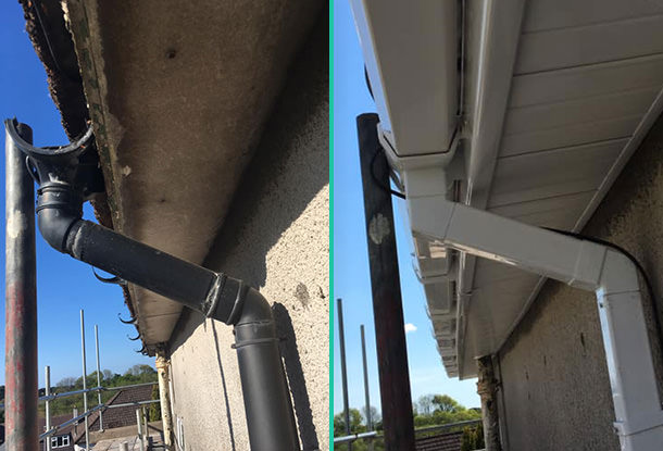 The fascia, soffit and guttering were rotten and damaged. We replaced it with white uPVC for a durable, easy maintenance solution and cleaner look.